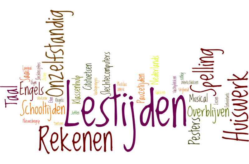 Hierna volgde de vraag 'Wat vond je het minst leuk aan de basisschool?'. De basisschoolleerlingen gaven als antwoorden: